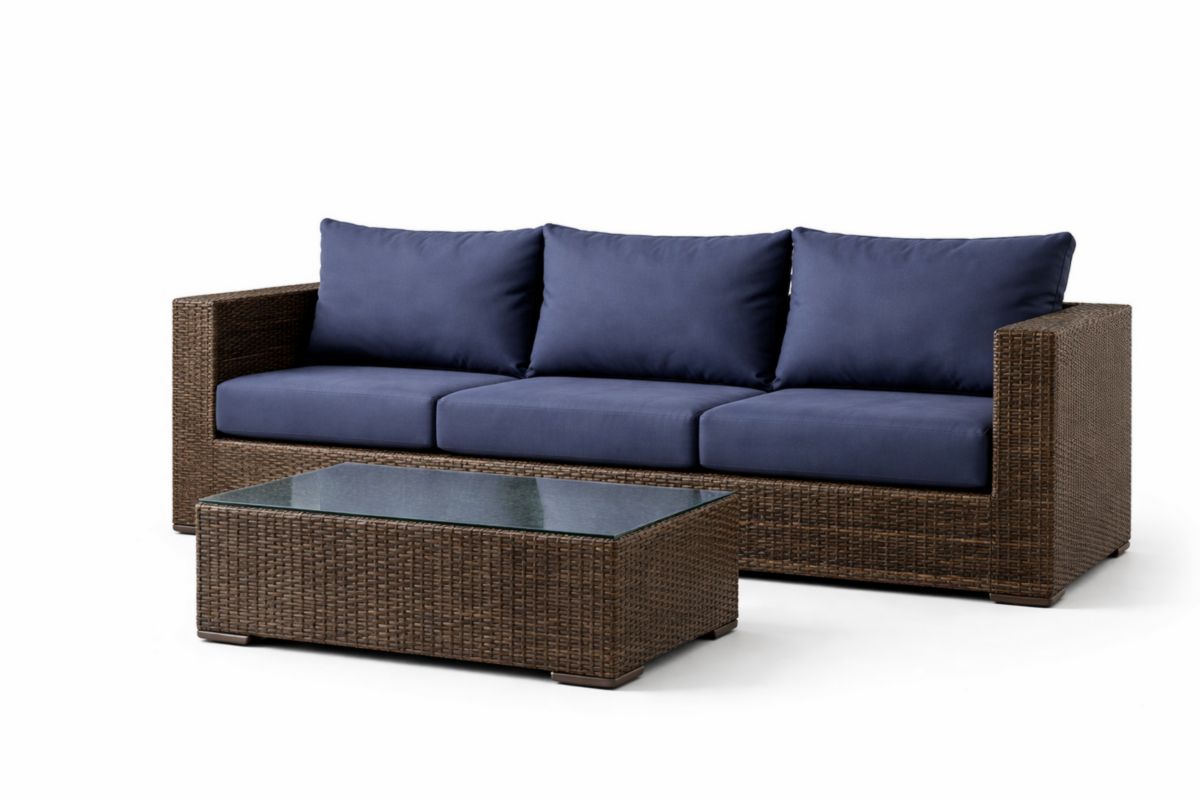 Set divano in rattan sintetico con cuscini blu e tavolino in vetro temperato